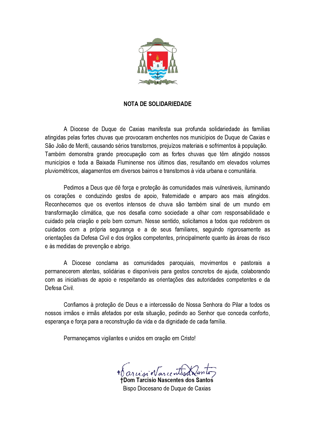 Por fim, a Diocese de Duque de Caxias conclama as comunidades paroquiais, pastorais e movimentos a permanecerem atentas e disponíveis para gestos concretos de solidariedade, colaborando com as iniciativas de ajuda e respeitando as orientações das autoridades. A todos os afetados, confia a intercessão de Nossa Senhora do Pilar, pedindo conforto, esperança e força para a reconstrução da vida e da dignidade de cada família.