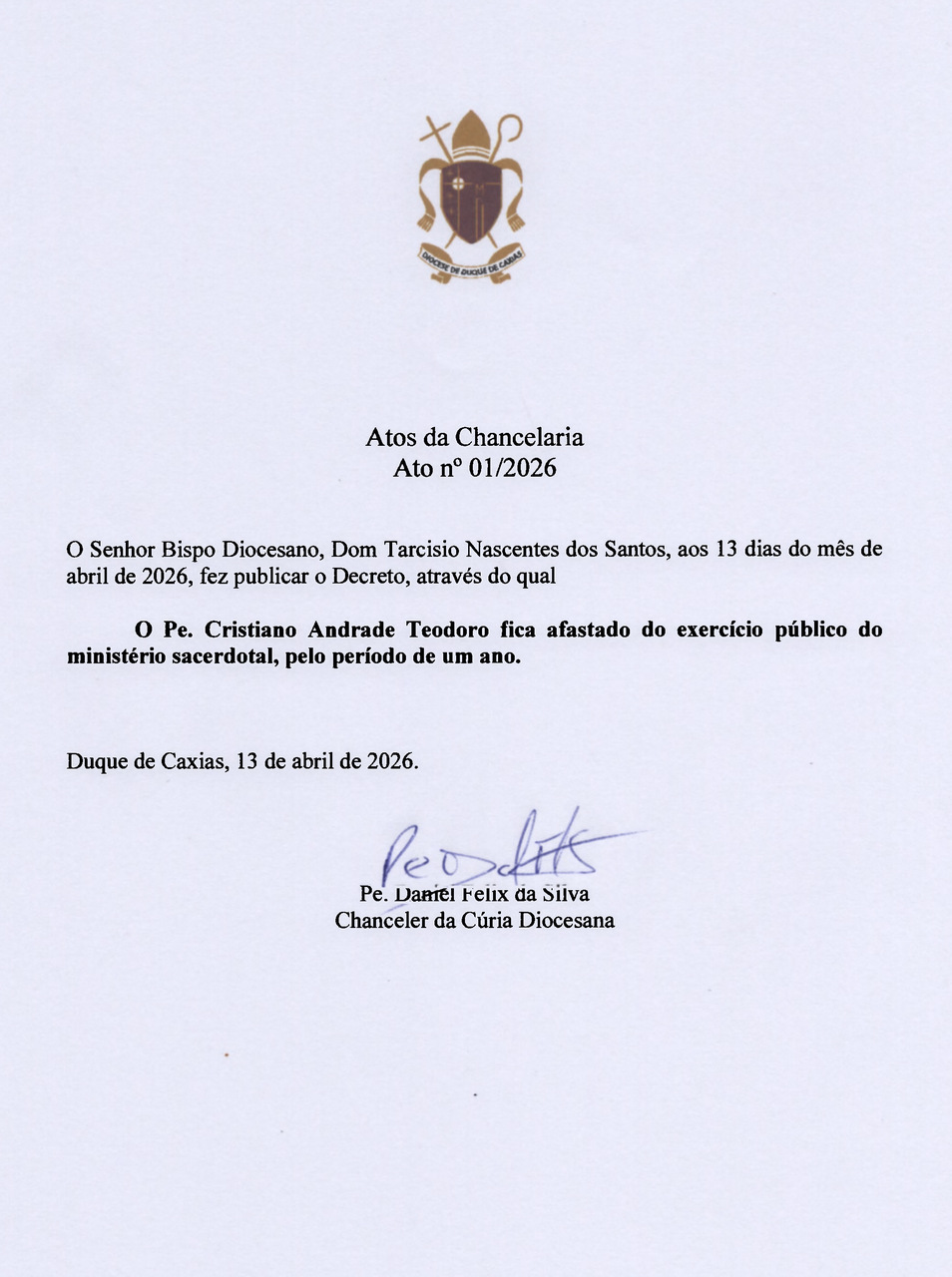 A Diocese de Duque de Caxias publicou, no dia 13 de abril de 2026, o Ato nº 01/2026 da Chancelaria, por meio do qual comunica o afastamento do padre Cristiano Andrade Teodoro do exercício público do ministério sacerdotal pelo período de um ano.