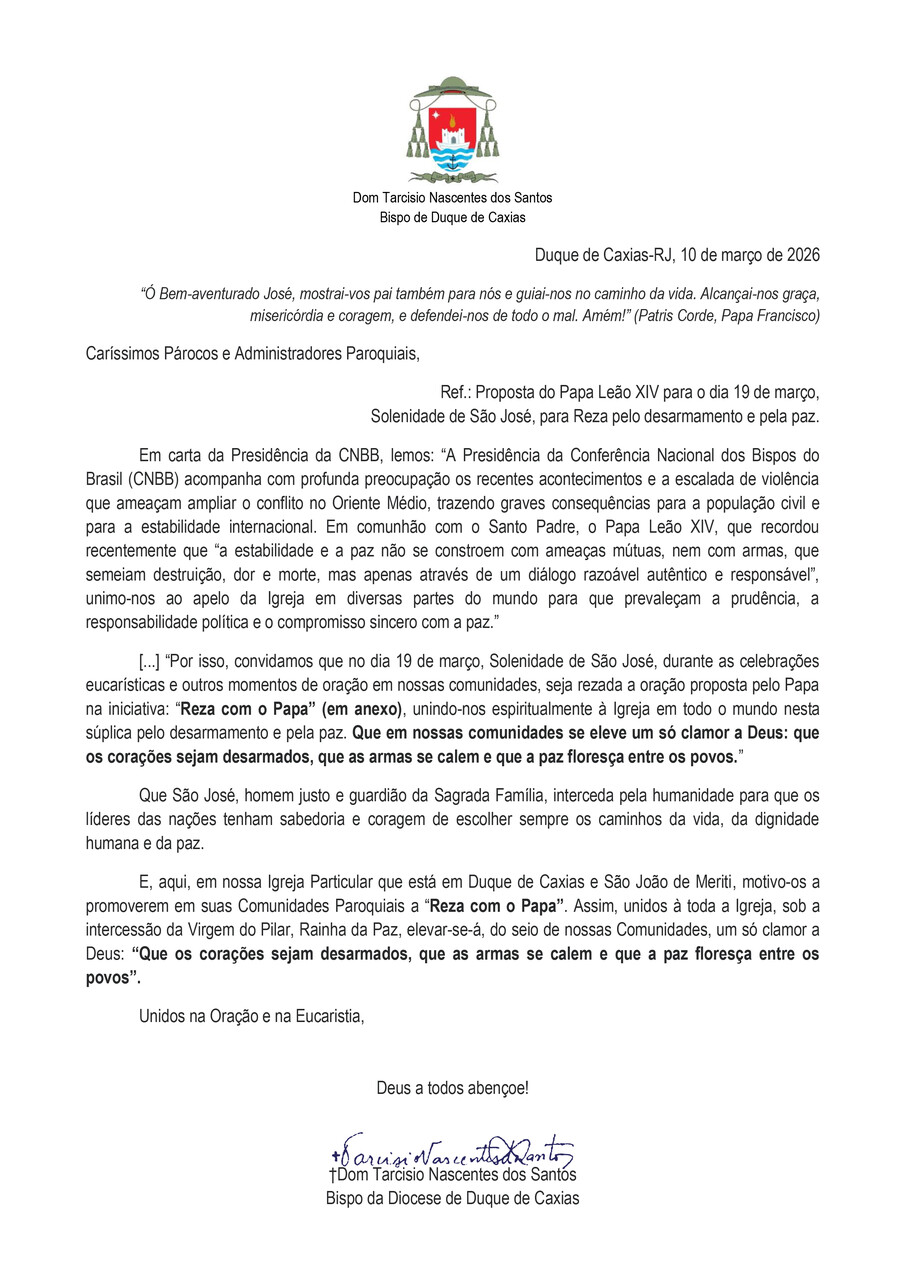 Em carta enviada aos párocos e administradores paroquiais, o bispo da Diocese de Duque de Caxias, Dom Tarcisio Nascente dos Santos, convidou as comunidades a intensificarem a oração pela paz no próximo dia 19 de março, Solenidade de São José.