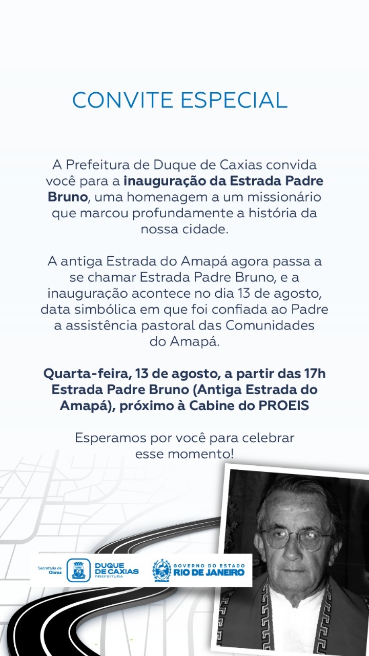 A Prefeitura de Duque de Caxias inaugura, nesta quarta-feira (13), a Estrada Padre Bruno, novo nome da antiga Estrada do Amapá. A mudança presta tributo a um sacerdote que deixou marcas profundas na história e na fé da Baixada Fluminense.