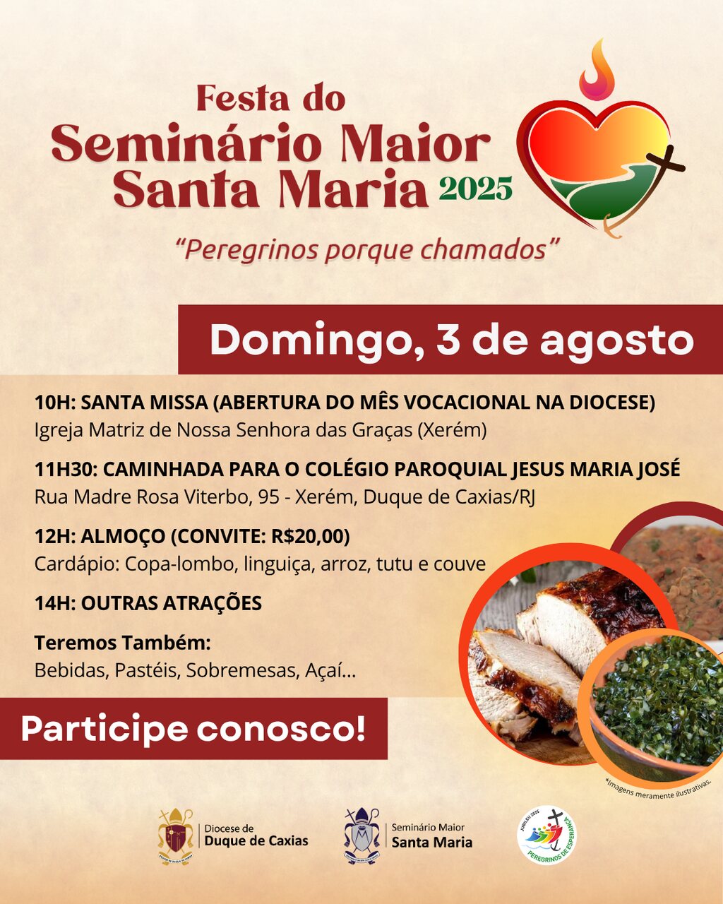 A programação começa às 10h com a Santa Missa na Igreja Matriz de Nossa Senhora das Graças, em Xerém, seguida por uma caminhada até o Colégio Paroquial Jesus Maria José. Às 12h, será servido o almoço comunitário — com convites a R$ 20,00 — reunindo a comunidade em um momento de fraternidade e partilha. No cardápio, copa-lombo, linguiça, arroz, tutu e couve. A partir das 14h, outras atrações estarão disponíveis, além de bebidas, pastéis, sobremesas e açaí.