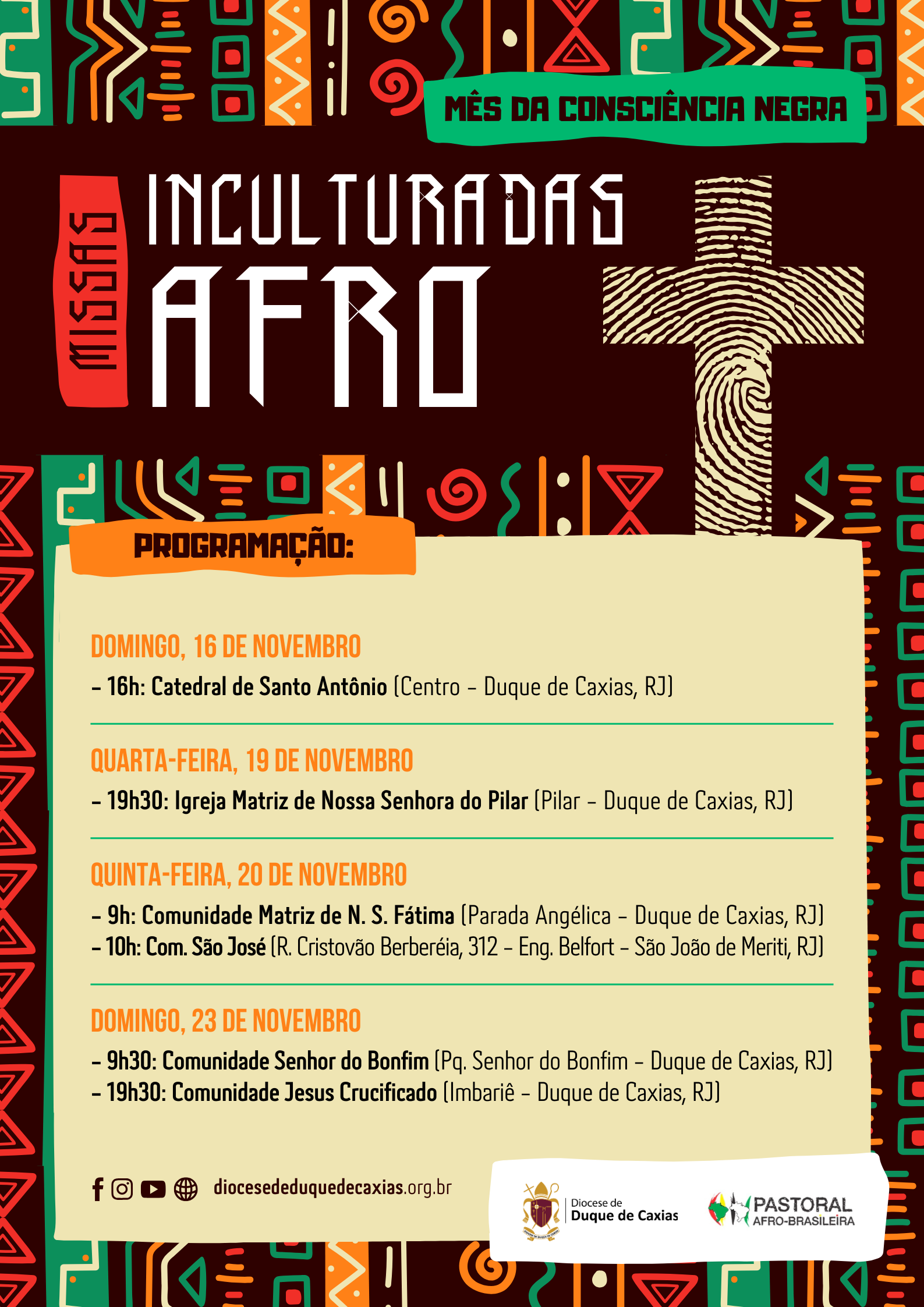 A programação começa no domingo, 16 de novembro, às 16h, na Catedral de Santo Antônio, no Centro de Duque de Caxias. Segue na quarta-feira, 19, às 19h30, na Igreja Matriz de Nossa Senhora do Pilar, no bairro Pilar. No dia 20 de novembro, data simbólica para o movimento negro, haverá celebrações às 9h, na Comunidade Matriz de Nossa Senhora de Fátima, em Parada Angélica, e às 10h, na Comunidade São José, em Engenheiro Belfort, São João de Meriti. O ciclo se encerra no domingo, 23, com missa às 9h30 na Comunidade Senhor do Bonfim e, às 19h30, na Comunidade Jesus Crucificado, em Imbariê.