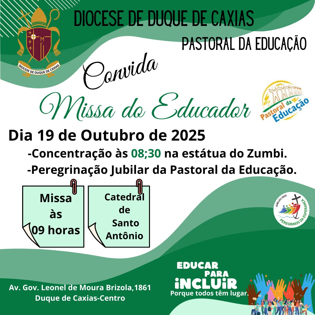 A Pastoral da Educação da Diocese de Duque de Caxias organiza, para outubro de 2025, dois momentos especiais voltados aos educadores, estudantes e agentes pastorais: a Missa do Educador, no dia 19 de outubro, e a Jornada Diocesana da Educação, marcada para o dia 25 de outubro.
