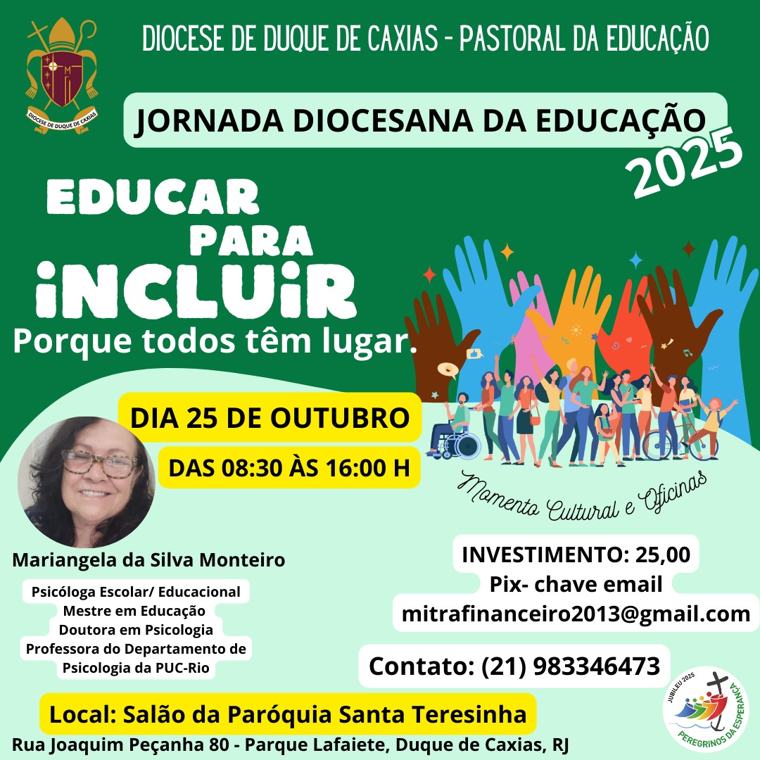 Na sequência da programação, no sábado seguinte, dia 25 de outubro, acontece a Jornada Diocesana da Educação 2025, no Salão da Paróquia Santa Teresinha, em Parque Lafaiete. O encontro terá como tema “Educar para incluir: porque todos têm lugar”, e contará com momentos de formação, oficinas e partilhas.