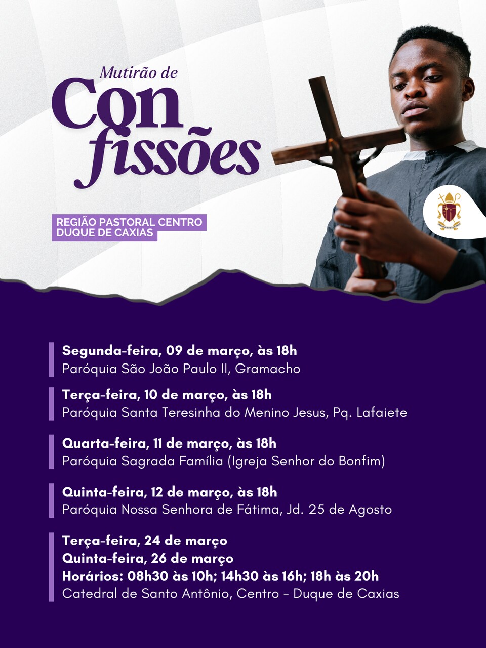 A Região Pastoral Centro, da Diocese de Duque de Caxias, promove ao longo do mês de março o Mutirão de Confissões, uma iniciativa própria do tempo da Quaresma que busca ampliar a oferta do Sacramento da Reconciliação e ajudar os fiéis na preparação espiritual para a Páscoa.